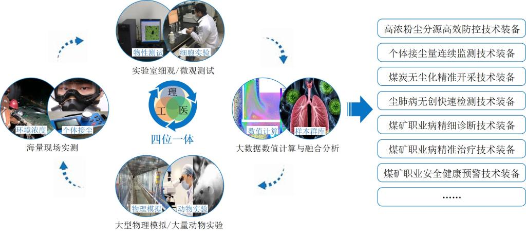 袁亮院士强调,“工业4.0”势头强劲,精准开采、精准医疗、大数据等技术突飞猛进,给煤矿职业安全健康发展提供了前所未有的机遇,为实现煤矿作业环境革命和煤矿从业人员职业生命全周期职业安全健康提供了可能,在此背景下,他提出了理工医多学科交叉融合的煤矿粉尘防控与职业安全健康科学构想。该构想基于理工医多学科交叉融合,以大数据、云技术、人工智能和物联网等高新信息技术为支撑,创新“四位一体”科学研究方法,以煤矿无害作业、职业病精准治疗和职业安全健康智能预警等为核心,最终实现煤矿从业人员职业生命全周期职业安全健康。